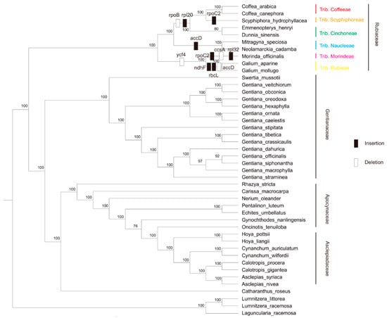 To gain an insight into the position of Scyphiphora in Gentianales and in an attempt to hypothesize when changes have taken place between/among the species and major clades, 40 cp genomes of Gentianales (data present in NCBI on 20 July 2019), including S. hydrophyllacea, were compared with each other. Furthermore, three mangroves species in Combretaceae—Lumnitzera littorea (Jack) Voigt, Lumnitzera racemosa Willd., and Laguncularia racemosa Gaern. f.—were chosen as out-groups. To minimize the overrepresentation of duplicated sequences, one of the IR regions in each plasmid was removed before analyses. Using the software MAFFT v7.427 [], multiple sequence alignment was performed using default values. The software IQ-TREEv1.6.10 (http://www.iqtree.org) was used to select the best model, TVM+F+R3, and build the maximum likelihood tree with default parameters. For the insertion and deletion events analysis in Rubiaceae, multiple sequence alignment was analyzed among 10 cp genomes. According to the annotation results of the S. hydrophyllacea cp genome, all compared exons including indel regions were manually extracted using MEGA v6.0. The main indel of the indel length >10 bp was kept [].