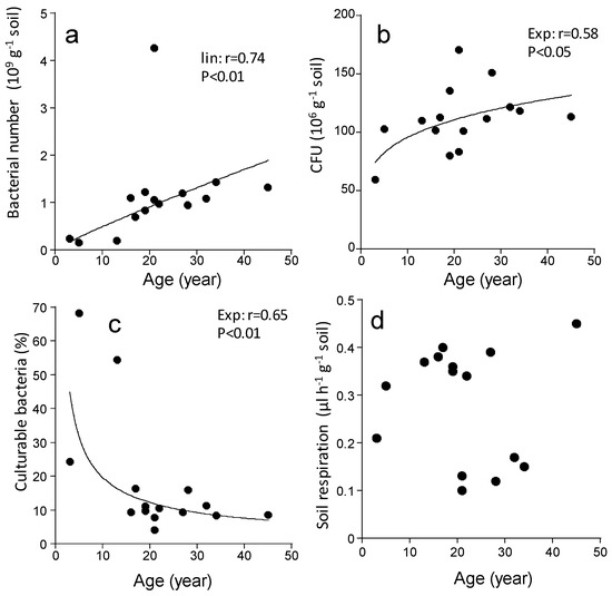 Relationship between site age and the total number of bacteria as determined by direct counts (a), number of culturable bacteria (b), percentage of culturable relative to the total number of bacteria (c), and soil respiration (d).