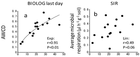 In the RDA, the microbial response of eight substrates chosen from Biolog substrates explained 74.4 % variation of all substrates used in Biolog data. When we compared the SIR and Biolog data for the eight substrates that were common to both methods, a positive correlation between SIR and Biolog was detected for N-acetyl-D-glucosamine but not for the other seven substrates (Figure 3, Table 2). Correlation coefficients between SIR and Biolog methods were negatively correlated with total number of bacteria (r = −0.60).