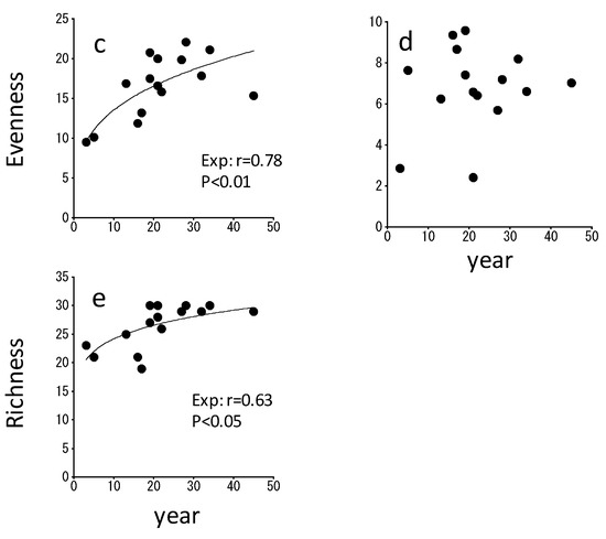 Relationship between site age and average microbial catabolic activity (a,b) and catabolic evenness (c,d) as determined by Biolog and substrate-induced respiration (SIR) methods, and between site age and catabolic richness as determined by Biolog (e). Richness is not presented for the SIR data because the soil microbial communities responded to every substrate at every site. Average microbial catabolic activity in Biolog indicates average well-color development (AWCD).