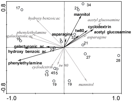 Principal component analysis (PCA) ordination diagram of individual substrates in Biolog and SIR with the options “standardization of sites” and “centering by substrate”. Circles represent individual sites. Narrow arrows represent substrates, bold arrows represent environmental variables. age: site age, C ox: oxidizable carbon, litter: litter mass, root: root mass, methyl glucoside: β-methyl-D-glucoside, galactonic ac lactone: D-galactonic acid g-lactone, arginine: L-arginine, pyruvic ac methyl ester: pyruvic acid methyl ester, xylose: D-xylose, galacturonic ac: D-galacturonic acid, asparagine: L-asparagine, tw40: tween 40, erythritol: i-erythritol, 2-hydroxy benzoic ac: 2-hydroxy benzoic acid, phenylalanine: L-phenylalanine, tw80: tween 80, mannitol: D-mannitol, hydroxy benzoic ac: 4-hydroxy benzoic acid, serine: L-serine, cyclodextrin: α-cyclodextrin, acetyl glucosamine: N-acetyl-D-glucosamine, hydroxybutyric ac: γ-hydroxybutyric acid, threonine: L-threonine, glucosaminic ac: D-glucosaminic acid, itaconic ac: itaconic acid, glycyl glutamic ac: glycyl-L-glutamic acid, cellobiose: D-cellobiose, glucose phosphate: glucose-1-phosphate, keto butyric ac: α-keto butyric acid, lactose: α-D-lactose, glycerol phosphate: D,L-α-glycerol phosphate, malic ac: D-malic acid.
