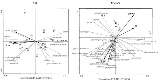 The first two ordination axis of PCA for both SIR and BIOLOG data explain more than 50% of data variability (Figure 4). In the PCA of the Biolog data, a substantial proportion of the variation was explained by EC, on the 1st axis and by soil carbon content, pH, and litter quantity on the 2nd axis (Figure 4, Table 3). In the PCA of the SIR data, a substantial proportion of the variation on the 1st axis was explained by pH, soil carbon content, and litter quantity (Figure 4, Table 3), the eigenvalue of the 1st axis was 0.628.