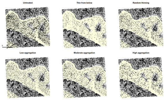 For each mechanical thinning simulation, we used a target basal area of 11.5 m2 ha−1 (Table 1). These values were chosen based on guidelines recommended for the region [19] and a silvicultural prescription developed for the site. We conducted 10 simulations for each stochastic thinning treatment. Example simulations for each treatment are shown in Figure 2. To simulate random thinning, we thinned all small trees (< 12.7 cm, < 5 in.) to a density of 40 ha−1 and then randomly selected larger trees for removal to reach the basal area target. To simulate thinning from below, we thinned starting with the smallest trees and proceeded to larger trees until the basal area target was reached.