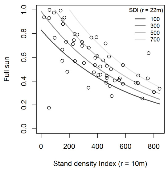 Light availability expressed as proportion of full sun for dry-mixed conifer stands as a function of stand density index measured at radii of 10 and 22 m. Solid grey lines represent predicted values for combinations of stand density index at small (r = 10 m), and large (r = 22 m) scales.