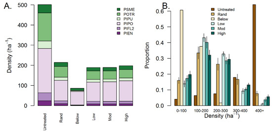 (A) Tree species composition with treated stands. Species include Pseudotsuga menziesii (PSME), Populus tremuloides (POTR), Picea pungens (PIPU), Pinus ponderosa (PIPO), Pinus flexilis (PIFL2), and Picea engelmannii (PIEN). (B) Within-stand horizontal stem density variability for simulated treatments calculated within 20 m × 20 m grid cells. Bars present mean 1 standard deviation among 10 simulations.