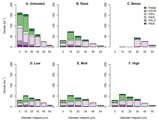 Diameter distribution by tree species among simulated treatments in dry mixed conifer stands. Numbers on x-axis represent midpoint of 10 cm diameter bins. Simulations for (A) untreated, (B) random thinning, (C) thinning from below, and (D) low, (E) moderate, and (F) high aggregation are shown. Species codes are as in Figure 4.