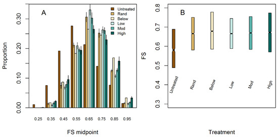 Increases in mean light availability were relatively similar across treatments, but treatments exhibited differences in within-stand variability in light levels (Table 5, Figure 6A). Mean light availability increased from 0.592 FS in the untreated stand to between 0.676 FS in the thin from below treatment to 0.665 in the low-aggregation treatment (Table 5). Variability of light levels paralleled results for within-stand horizontal complexity, where untreated stands had light levels primarily concentrated in the 0.40 to 0.60 FS range, whereas thinning from below concentrated a large area in the 0.70 to 1.0 FS range (Figure 6A). Among the aggregated treatments, the highly aggregated stand had the greatest variability in light availability (Table 5). Highly aggregated stands had more total area concentrated in the lowest (0.50) and highest (>0.80) light ranges compared to the other aggregated treatments. Conversely, the low- and moderate-aggregation treatments had a greater proportion of area concentrated in moderate light levels (0.50–0.80, Figure 6A). Changes in high-light availability increased in all treatments, with the 75th percentile FS increasing from 0.689 in untreated stands to between 0.745 to 0.778 (Table 5). Among the treated stands, 75th percentile FS was highest in the high-thin from below (0.778) and high-aggregation treatment (0.773), lowest in the low-aggregation treatment (0.745), and moderate in the random thinning and moderate-aggregation treatment (0.755) (Table 5).