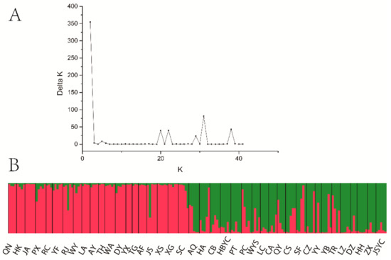 Population genetic structure. (A) Relations between the rational groups number K and estimated value ΔK. (B) Genetic structural plot of 41 C. camphora populations based on structure analysis. Each individual is represented by a single vertical bar, which is partitioned into two different colors.