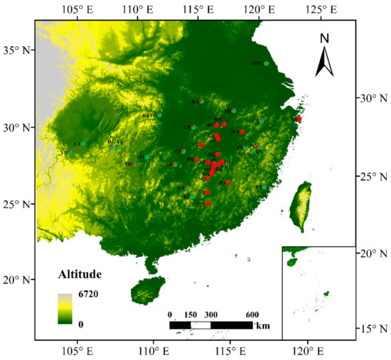 Geographical distribution of the plant materials. Solid dots indicate the populations that were collected in South China.