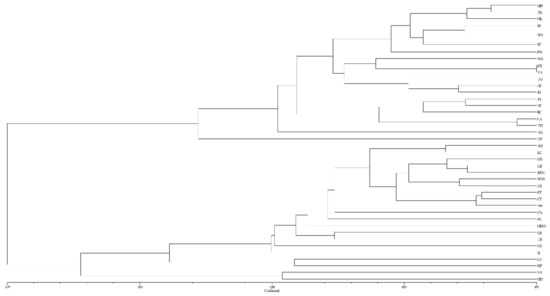 Genetic divergence among 41 populations of C. camphora based on UPGMA clustering analysis.