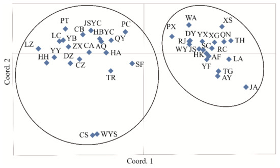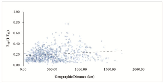 AMOVA revealed a strong population genetic structure at the species level (FIS = −0.207, p < 0.001). We also used STRUCTURE software to analyze the genetic structure of C. camphora populations. The result showed that ΔK was the highest when K = 2 (Figure 2A), indicating that the 41 C. camphora populations could be divided into 2 groups (Figure 2B). The proportion of cluster members of each individual from 41 populations is shown in Figure 2B. Individuals with a proportion higher than 0.75 were considered pure, and those with a score lower than 0.75 were considered admixed. In the first group, the red cluster included 86 individuals with 82 pure and 4 admixed individuals, while the green cluster included 94 individuals, with 88 pure and 6 admixed. Nearly all populations from Jiangxi and XS—except the RJ, JS, SC, and ZX populations—entirely consisted of individuals from the red cluster, whereas other populations consisted of individuals from the green cluster (Figure 2B). Based on the Q values, we also graphed the proportion of cluster members for each population at K = 2 (Figure 3). The graphs showed that the geographical distribution was relatively clear. The first cluster (red), including 19 populations from Jiangxi Province and the XS population from Zhejiang Province, had a larger proportion than the second cluster. In the second cluster, including 20 populations from other provinces and the ZX population from Jiangxi Province, the green cluster had a larger proportion than the red cluster, with a very small proportion from the red cluster (Figure 3). This result is consistent with that of UPGMA clustering analysis (Figure 4). Similarly, the two clusters were clearly distinguished by PCoA analysis: the populations from Jiangxi Province (except ZX) and XS from Zhejiang were grouped as cluster I, and the other 21 populations were grouped as cluster II (Figure 5). We further analyzed the correlation between pairwise FST and geographical distance (Figure 6) using the Mantel test. The results showed that there was a significant correlation between genetic distance and geographic distance (r = 0.159, p = 0.026), indicating a clear geographic origin-based structuring or predominate isolation by distance among the investigated populations.