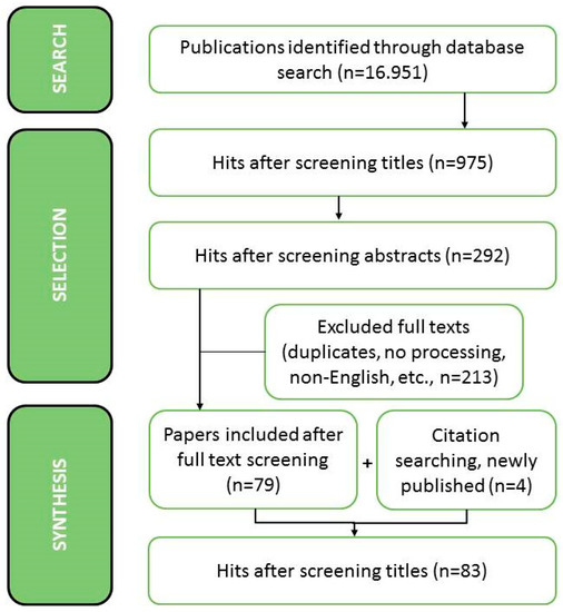 In order to consolidate the current evidence base on processed, commercialized NTFPs, the systematic review approach, as illustrated by Petticrew and Roberts 2012, was applied. It provides clear procedures, starting from refining the research question, moving on to retrieving the literature, and finishing with synthetizing the evidence [77]. Keywords for the literature search were divided into two categories, the first of which considered NTFPs and synonyms such as “non-wood forest product,” “NWFP,” or “edible wild plants.” The second category reflected keywords associated with commercialization and processing, such as “product develop*,” “market*,” “upgrad*,” “process*,” “enterprise,” or “SME.” The combination of the keywords of both categories using the Boolean operator “and” across five different scientific search engines (Web of Science, Science direct, T&F online, and Emerald, Springer online) led to the identification of 16,951articles. Studies were included in the final database based on the adoption of exclusion and inclusion criteria defined in Table 1. The selection process was conducted in three steps, first via screening the titles, secondly the abstracts, and finally, by screening the specific content of the full-text articles against the inclusion and exclusion criteria. In addition to the keyword-search, citation searching in full-text articles was conducted to identify further candidate studies. Overall, the literature search and application of the inclusion and exclusion criteria resulted in the identification of 83 studies focusing on commercialized, processed NTFPs (Figure 1). The literature search was conducted early 2019 and repeated in July 2019 to cover for newly published articles. It is anticipated that the database comprehensively captures the rapidly expanding literature on NTFP processing. Nevertheless, it cannot be ruled out that a small number of relevant studies have been excluded.