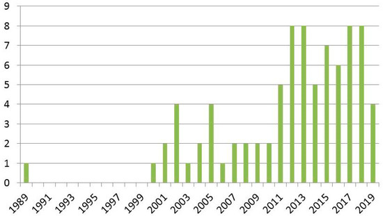 The identified articles were published between 1989 and 2019 (Figure 2). However, over 70% of the studies were published from 2011 onwards, indicating the rising scholarly interest in NTFP commercialization. Almost half of the articles (n = 39) were based on studies in Africa. Next were articles from Asia (n = 17) and South America (n = 13), whereas relatively few articles featured studies from Europe, North America, or Australia. A total of 73 different NTFP species were investigated; however, 28 articles did not provide in-depth taxonomic information on the species utilized. The most commonly investigated, processed NTFP species included the Brazil nut Bertholletia excelsa Bonpl. [80,81,82]; the processed kernels of Ricinodendron heudelotii (Baill.) Heckel, which are used as a flavoring agent [83,84,85,86]; butter derived from the fruits of the shea tree Vitellaria paradoxa C.F.Gaertn. [87,88,89]; and beverages made from the fruits of the Marula tree Sclerocarya birrea (A.Rich.) Hochst. [90,91,92]. Besides food products, the articles also encompassed a wide variety of other product categories, including different types of household goods (e.g., brushes and brooms, baskets and handbags, mats, ropes, etc.), artwork, and cosmetic products (Table 3). These findings are in line with the often-cited diverse nature of NTFPs. In approximately half of the case studies, the NTFP collectors were directly involved in processing activities, although these were typically only basic value-addition activities. In other cases, more or less formal arrangements with processors were observed. In over 70% of the studies, NTFPs originated from wild sources; approximately 11% were cultivated and 17% stemmed from both cultivated and wild sources. Approximately half of end products were targeted solely towards local and regional markets; 26% of NTFPs targeted export markets; and the remaining either national markets (6%) or a mixture of domestic and export markets (18%). More commonly identified processed NTFPs targeted niche markets (57%) in comparison to mass markets (43%). In roughly a third of the case studies identified, NTFP development received external support, most commonly through development initiatives.