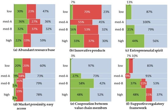 Frequency distribution (%) of selected success factors (panels a–f) depending on level of commercialization (green: factor present in case study; red: factor not present; grey: not sufficient or inconclusive information provided).