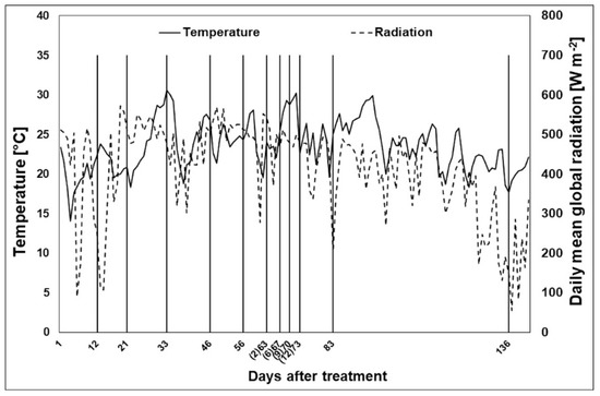 The daily average temperature was 21.5, 24.5, 24.7, 25.4, and 21.1 °C in May, June, July, August, and September, respectively (Figure 1). The highest temperature was recorded on the 34th (30.6 °C) and the 73rd (30.2 °C) days after the beginning of salt treatment, while the lowest was recorded on the 23rd day (18.3 °C). The daily mean radiation values were 375, 486, 463, 427, and 282 W m−2 in May, June, July, August, and September, respectively (Figure 1).