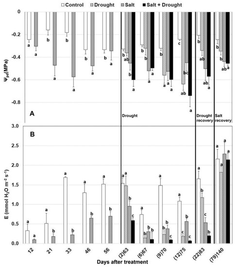 Effect of drought, salt, and the combination of both stresses, on (A) predawn water potential (ψpd) and (B) transpiration rate. The days after drought treatment are reported in brackets. Values per treatments are mean ± SE (n = 10). Data characterized by the same letter do not differ significantly (p < 0.05, Tukey’s HSD test).