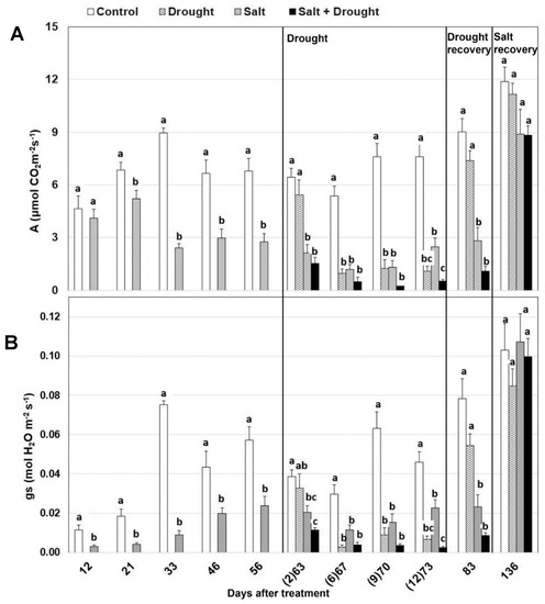 Effect of drought, salt, and the combination of both stresses on (A) photosynthesis and (B) stomatal conductance. The days after drought treatment are reported in brackets. Values per treatments are mean ± SE (n = 10). Data characterized by the same letter do not differ significantly (p < 0.05, Tukey’s HSD test).