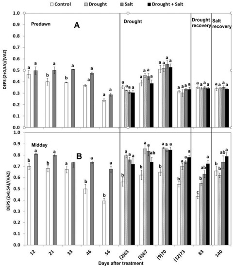 Effect of drought, salt, and the combination of both stresses on de-epoxidation state of the xanthophyll cycles (DEPS) at predawn (A) and midday (B) of sweetgum plants. The days after drought treatment are reported in brackets. Values per treatment are mean ± SE (n = 10). Data characterized by the same letter do not differ significantly (p < 0.05, Tukey’s HSD test).