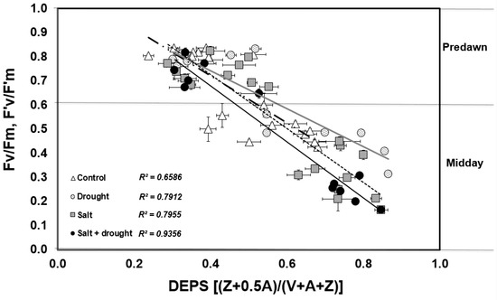 The de-epoxidation state of xanthophyll cycle pigments (DEPS) was generally higher at midday in stressed leaves compared to the control (Figure 4B). The maximum levels of 0.84–0.86 were reached during the water stress period in salt and drought-stressed leaves, as a result of the almost complete de-epoxidation of violaxanthin into zeaxanthin. At predawn, lower levels were recorded, with an average of 0.5, indicating a partial conversion of zeaxanthin to violaxanthin overnight (Figure 4A). Xanthophyll DEPS at predawn and at midday correlated well with photosynthetic efficiency in the dark (Fv/Fm) and in the light (F’v/F’m): the PSII efficiency decreased as DEPS increased (Figure 5). This was more evident in plants stressed with water withholding alone or in combination with salt (r2 = 0.80 and r2 = 0.94, respectively) than in control or salt-stressed plants (r2 = 0.64 and r2 = 0.80, respectively).