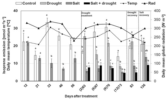 Effect of drought, salt, and the combination of both stresses on isoprene emission in sweetgum plants. Values are mean ± SE (n = 10). Data characterized by the same letter do not differ significantly (p < 0.05).