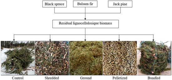 The biomass residues from each species were prepared before the extraction of EOs. Figure 1 shows the five different methods used: (i) shredding using a branch shredder (Bandit, model: 65 XP compact disc); (ii) shredding, grinding, and milling using an industrial grinder equipped with a screen grate (Mills, Buffalo, NY, USA) and drying (Dryer, Abri-Tech Inc., Namur, QC, Canada) to decrease the biomass moisture content to below 40%; (iii) shredding, grinding, and pelleting using a KHAL mill (Amandus Kahl GmbH and Co.KG, Germany) with a capacity of 50 kg/h and a pellet pilot machine with a die filling at 6 mm of diameter for densification; (iv) densification into bundles (with no pretreatment) using a cylindrical mold placed under a mechanical testing machine at compaction forces up to 50 kN (Zwick Roell Z100, Zwick GmbH and Co.KG, Germany); and (v) for purposes of comparison, a non pretreated material was used as a “control”.