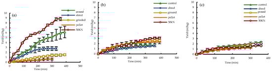 The yield of EOs extracted from untreated, shredded, ground, and densified (pellets and bundles) (50 kN) residual forest biomass: (a) balsam fir (BF), (b) black spruce (BS), and (c) jack pine (JP) by hydrodistillation.