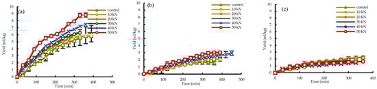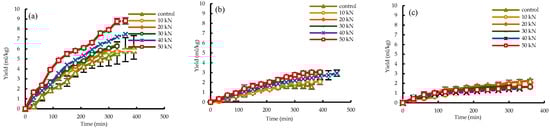 The yield of EOs extracted by steam distillation from residual forest biomass densified into bundles for (a) BF, (b) BS, and (c) JP.