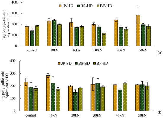 Effect of compression level (10–50 kN), species type (BF, BS, and JP), and extraction method—(a) hydrodistillation (HD) and (b) steam distillation (SD)—on total phenol content.