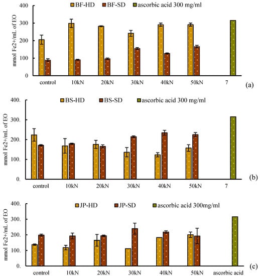 The iron reduction capacity of EOs extracted from BS relative to compression level and extraction process is shown in Figure 6b. The ferric reduction power of EO extracted by hydrodistillation from BS bundles compacted at 50 kN increased from 157.6 mmol Fe2+/mL (control material) to 223.63 mmol Fe2+/mL. On the other hand, steam extraction resulted in a 23% improvement of ferric reduction power. It passed from 171.4 mmol Fe2+/mL (control material) to 225.3 mmol Fe2+/mL for EO extracted from BS bundles compacted at 50 kN. Indeed, the reducing power of EOs extracted from BS can be explained by the strong affinity created between the polyphenols and the metal ions of the ferric ion (Fe3+). Similarly, other compounds such as alcohols (linalool and 1,8-cineole), ketones (menthone and isomenthone), aldehydes (neural and citronellol), esters, and hydrocarbons (α-terpinene and α-terpinol) can participate in the reduction of ferric iron (Fe3+) to ferrous iron (Fe2+) and have synergistic effects on the determination of the antioxidant activity of EOs []. These observations are consistent with the qualitative analysis of EOs from BS and their amount of oxygenated compounds (see Section 3.2).