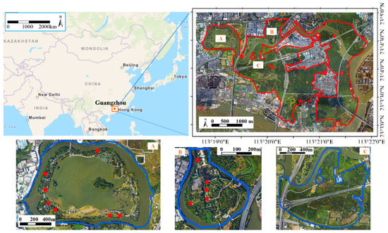 The Haizhu National Wetland Park (centered at 23°04′7.06″N, 113°20′2.30″E) is located in the city of Guangzhou in Guangdong Province in South China. This wetland covers approximately 869 ha (377 ha are water area), with an elevation range of −1 to 9 m above sea level. It is a composite wetland ecosystem of the Pearl River Delta, inland lake wetland, and orchard, but it also contains land cover types such as roads, water, and buildings. It is also an important ecological barrier in South Guangzhou. The Haizhu National Wetland Park consists of three parts (marked A–C in Figure 1). Area A is also referred to as Haizhu Lake Park, and a forest (dominant by broadleaved trees) grows along the lake. Area B is a semiconstructed wetland mixed with various broadleaved trees, including flowering and fruit trees. Area C is mainly covered by neatly arranged fruit trees. On the basis of the original orchard, tree species enrichment and habitat restoration have been conducted for the Haizhu National Wetland in the past few years, making it a good ecological environment for birds. The forest across Haizhu National Wetland Park is now heterogeneous with approximately 20 dominant tree species, including evergreen broadleaved species (such as Ficus microcarpa Linn. f., Delonix regia, and Chorisia speciosa A.St.-Hil) and fruit trees (such as longan and litchi). Here, we selected all of Area A and parts of Areas B and C as the study area (Figure 1).