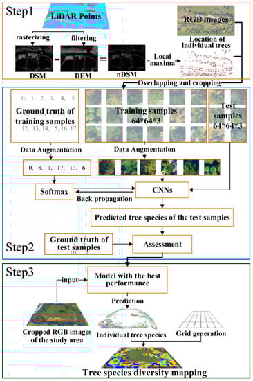 The flowchart that includes three main steps for identification of tree species based on the deep learning approaches.