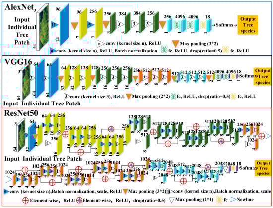 Our tree species classification strategy takes advantage of recent CNNs for patch-wise classification. We formulated the tree species classification as a supervised image classification problem to identify 18 tree species (17 dominant trees species and a class of “Others”). For this purpose, we adopted AlexNet, VGG16, and ResNet50 implemented in Caffe for individual tree classification. Some adaptive modifications were made for our tree classification problem: (1) The input image size was modified and set as 64 × 64 pixels instead of the original size of each convolutional neural network. (2) The corresponding convolutional and pooling layers were adjusted for feature extraction accordingly. (3) The final output layers were also modified to 18 classes, so as to distinguish 17 dominant tree species and the class of “Others”. The detailed architectures of the three CNNs are shown in Figure 4. In the procedure of our deep-learning-based tree species classification, both training and test data were image patches of individual tress.
