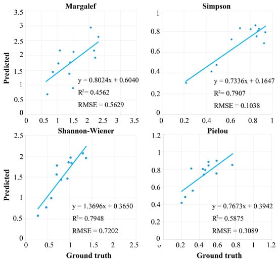 Based on the detected individual trees and the classified tree species, the diversity of three parts of the Haizhu Wetland could be mapped. In this paper, the study area was divided into grids with a spatial resolution of 30 × 30 m, and the grids without trees were dismissed. Richness and evenness are the two components of alpha diversity. Richness is defined as the total number of species in a particular quadrat size, while evenness accounts for relative species abundance [1]. A single diversity measure is not necessarily appropriate for characterizing diversity [42]. In this paper, the Margalef richness index [43], the Simpson diversity index [44], the Shannon–Wiener diversity index [45], the Pielou evenness index 1 [46], and the tree species richness were calculated (Table 1). The diversity indices considered both the richness and evenness of the tree species in the study area. The ground truth of the diversity indices in the 12 field-surveyed plots was calculated based on the equations in Table 1, and they were then compared with the prediction values of the corresponding grids.