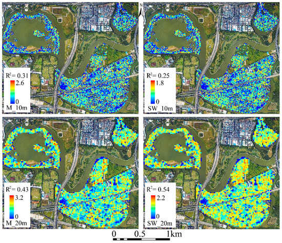 Tree species diversity maps at the spatial resolutions of 10 and 20 m. M_10m and M_20m represent the Margalef index at 10 and 20 m scales, respectively. SW_10m and SW_20m are for the Shannon–Wiener index at 10 and 20 m scales, respectively.
