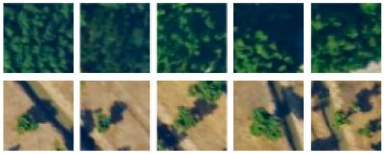 Tree patch samples over different image perspectives or light conditions. The first row is samples of banyan tree, while the second row is sakura tree.