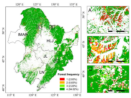 Ren, C.; Chen, L.; Wang, Z.; Zhang, B.; Xi, Y.; Lu, C. Spatio–Temporal Changes of Forests in Northeast China: Insights from Landsat Images and Geospatial Analysis. Forests 2019, 10, 937. https://doi.org/10.3390/f10110937