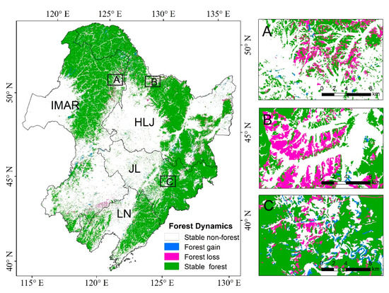 Spatio–Temporal Changes of Forests in Northeast China: Insights from Landsat Images and Geospatial Analysis