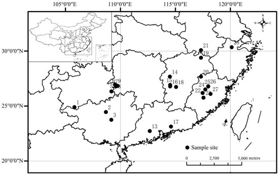 Data were collected from published studies on the leaf and soil nutrients of Chinese fir plantations. Leaf samples, used for determining the leaf N, P and N:P ratio, were all collected during the growing season (July–October). All of the studies that we collected included data on the leaf N and P concentration, and part of them included data on the leaf N:P ratio, while the other studies excluded data on the leaf N:P ratio. In the cases where data on the leaf N:P ratio were absent, we calculated the ratio using the leaf N and P concentrations data to remedy this lack. Additionally, we also collected data on the stand age, as well as data on geographical/climatic factors and soil nutrient concentrations, such as the Longitude (LON), LAT, Altitude (ALT), mean annual precipitation (MAP), MAT, and soil N and P concentrations at a layer of 20–30 cm. If the studies excluded data on the soil N or P concentrations, we used the arithmetic mean value of the data in a single age group to remedy this lack in order to avoid the influence of the stand age on the soil nutrient concentrations [19]. Overall, we collected 47 observations from 28 sampling sites across eight provinces in the main production regions of Chinese fir across subtropical China (Figure 1).