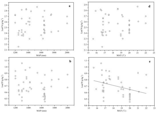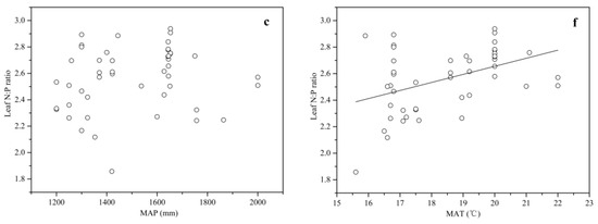 Relationships between the leaf stoichiometry and climatic variables for Chinese fir. Each data point represents an ln (N + 1)-transformed leaf N or P concentration or leaf N:P ratio. Linear fit for (e) the leaf P and MAT (mean annual temperature) (R2 = 0.11, p < 0.05); and (f) the leaf N:P ratio and MAT (R2 = 0.17, p < 0.01). No fit for (a) the leaf N and MAP (mean annual precipitation); (b) the leaf P and MAP; (c) the leaf N:P ratio and MAP; and (d) the leaf N and MAT.