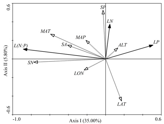 Bidimensional ordering chart of the RDA for the relationships between the leaf stoichiometry and influencing factors. LN is the leaf N concentration; LP is the leaf P concentration; L(N:P) is the leaf N:P ratio; SA is the stand age; LAT is the Latitude; LON is the Longitude; ALT is the Altitude; MAT is the mean annual temperature; MAP is the mean annual precipitation; SN is the soil N concentration; and SP is the soil P concentration. The leaf stoichiometry and influencing factors are represented by the solid and dotted line, respectively. The length of the arrow line represents the correlation level between the leaf stoichiometry and influencing factors. A longer line indicates a higher correlation. The angel between the two arrow lines can be considered an evaluation of the correlation level between the leaf stoichiometry and influencing factors. An angle between 0 and 90 degrees indicates a positive correlation between the two variables; an angle between 90 and 180 degrees indicates a negative correlation between the two variables shown; and an angle of 90 degrees shows no relationship between the two variables.