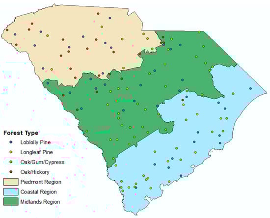 Four major forest types were analyzed. These include loblolly pine, longleaf pine, oak–hickory, and oak–sweetgum–cypress. FIA data showed that these were the most prolific forest types in South Carolina, and many landowners would have these forest types on their property. In total, 130 plots were chosen to model (Figure 1). Table 1 shows how many stands were analyzed for each forest type and the percent that forest type accounts for out of the total forested land in SC [].