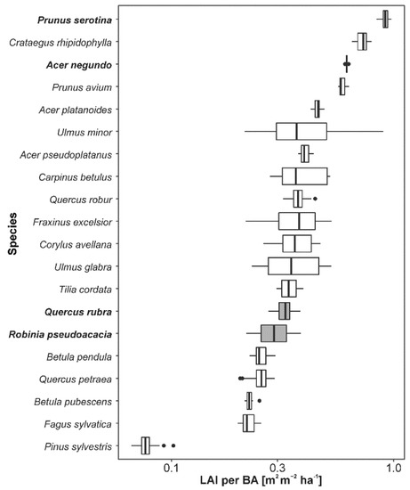 - Annighöfer, P.; Mölder, I.; Zerbe, S.; Kawaletz, H.; Terwei, A.; Ammer, C. Biomass functions for the two alien tree species Prunus serotina Ehrh. and Robinia pseudoacacia L. in floodplain forests of Northern Italy. Eur. J. For. Res. 2012, 131, 1619–1635. [Google Scholar] [CrossRef]