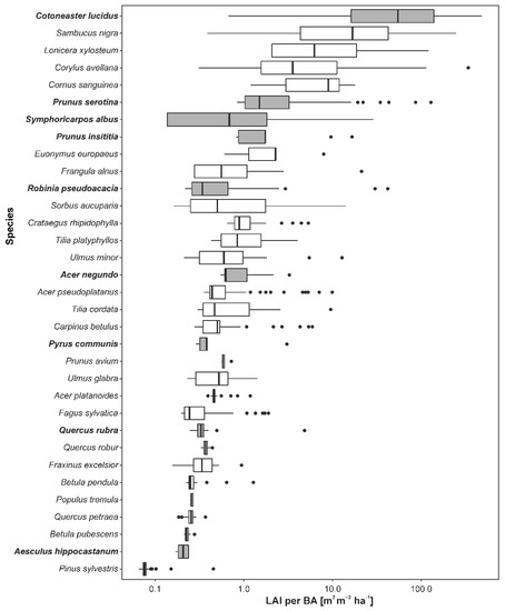 - Dyderski, M.K.; Jagodziński, A.M. Functional traits of acquisitive invasive woody species differ from conservative invasive and native species. NeoBiota 2019, 41, 91–113. [Google Scholar] [CrossRef]
