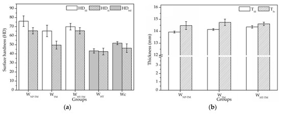 Normally, the compression state of TM wood is sensitive to moisture, which limits the usage of it to certain condition [12]. The thickness and surface hardness (HD) change of treated wood before and after the TM process, as well as compression recovery (HDr and Tr), are displayed in Figure 2. The NP-TM treatment resulted in a better surface strength and the compression-fixing ability for poplar. WNP-TM has higher HD value than that of WTM before and after the water soaking test.