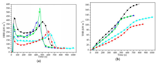 The HRR curve in Figure 3a reveals that the Wc had two sharp exothermic peaks; the burning of combustible gas emitted by the decomposition of the surface formed the peak HRR1 at 45 s, then the oxidation reaction of internal wood material formed peak HRR2 at 520 s because of the consuming and cracking of the surface charcoal layer.