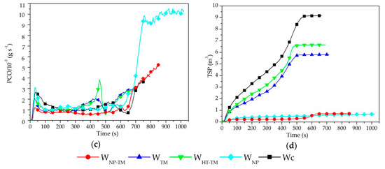 Taking an overall consideration of the cone testing results, we can find that surface cracking of WTM and WHT-TM occurred at high temperature, resulted in shifting forward of the Peak HRR2 (Figure 3a) and CO release (Figure 3b). Therefore, the surface cracking of WTM and WHT-TM was before 400 s and 450 s. The peak of CO release appeared with the surface cracking, caused by the anoxic burning of the inner material. Similarly, the surface cracking of WHT-TM was around 600 s, closing to the glowing phase. As shown in Figure 4c, the CO yield of WTM and WHT-TM started to increase from the interval of 400–600 s, and it started after 600 s in case of the WNP-TM.