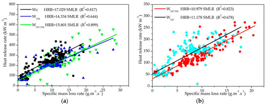 Equations of the linear statistical dependence of the HHR on the specific mass loss rate are listed in Figure 4a,b. Under perfect combustion, the HRR is a function of specific mass loss rate only (R2 = 1); the slope of fitting line was the smallest and the R2 value of WNP-TM was much higher than that of WNP, showing that the WNP-TM possesses higher combustion efficiency. Considering the lowest mean EHC (Table 3) and lowest heat release (Figure 3a,b), it can be concluded the combustion reaction of WNP-TM was the most moderate and stable.