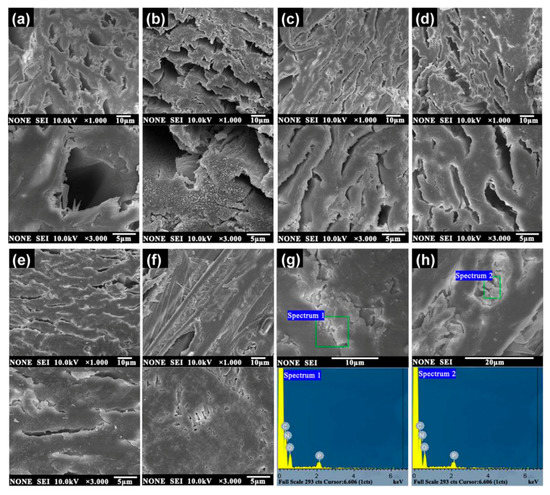 Scanning electron microscopy (SEM) micrographs of treated samples: (a) Wc; (b) WNP; (c) WTM; (d) WHT-TM; (e) WNP-TM on transverse section; (f) WNP-TM on tangential section; (g,h) energy-dispersive X-ray analysis (EDXA) spectra of WNP-TM.