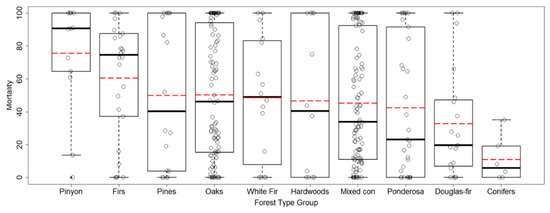 Distributions of observed fire-induced mortality as a percent of pre-fire, live tree basal area by forest type group, with mean (dashed red line), median (solid black line), quartiles (box ends), 5th and 95th percentiles (whiskers), and observations (open circles). Forest type groups arranged, left to right, from highest to lowest mean mortality.