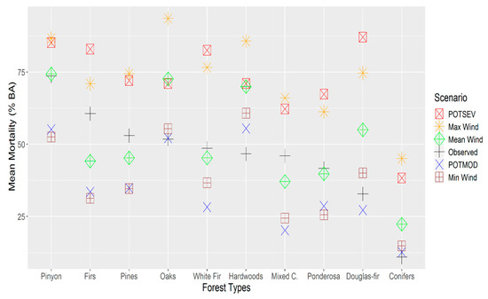 The most accurate weather scenario differed among forest type groups, with Mean Wind having the lowest error for five groups, POTMod for four groups, and Max Wind for one (Table 6). The Mean Wind scenario had the lowest error for the most abundant conifer types (California mixed conifer and Ponderosa pine), while the POTMod scenario had the lowest errors for the hardwood types (California oaks and other hardwoods). The high mortality rates of subalpine forests in the Firs group were most accurately modeled with the Max Wind scenario.